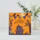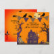 Spooky Halloween Party Invitation featuring a spooky landscape with a haunted house, spider's web, spooky trees, bats, flying witches, ravens, a black cat, graves, and so on.