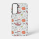 This design is a Halloween-themed pattern with a whimsical and playful design. The background colour is a soft pastel blue, and it is filled with various Halloween icons and symbols.