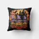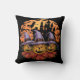 Three ominous scarecrows with menacing grins and witch hats stand against a haunting backdrop of bats and a castle beneath a glowing full moon.