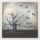 A spooky tree stands against the backdrop of a huge moon. A black raven sits in its branches and several bats fly in the air. The “Happy Halloween” can be changed or deleted if desired.