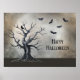 A spooky tree stands against the backdrop of a huge moon. A black raven sits in its branches and several bats fly in the air. The “Happy Halloween” can be changed or deleted if desired.