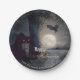 Haunted Halloween paper plates featuring a nocturnal landscape with black cat, a spider and bat at full moon. In the tree are subtle party lights.