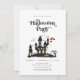 This editable haunted house Halloween party invitation sets the spooky tone for your Halloween bash. The THOMASIN Collection features a white background with a mix of fancy display, sans serif and script fonts in black. A creepy haunted house full of ghosts, a graveyard, spiderwebs, jack-o-lanterns, a coffin, and bats along with black clouds and an orange moon completes this spooktacular halloween party invite.