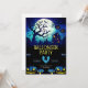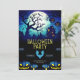 Join us for a night of frightful fun under the full moon! This atmospheric Halloween party invitation is perfect for setting a classic spooky mood. The design features a wonderfully eerie scene with a haunted house and a gnarled, spooky tree silhouetted against a giant, glowing moon. Bats fly through the starry night sky, and jack-o'-lanterns hang from the branches. The lower portion of the invitation is guarded by a patch of glowing blue pumpkins and some creepy, crawly spiders, inviting guests to a truly haunted celebration.