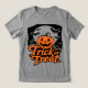 Celebrate the fun of Halloween with this spooktacular t-shirt! This design features a happy, carved pumpkin set against a bright full moon and a sky full of flying bats. The bold "Trick or Treat" lettering across the front makes this the perfect shirt for all your October festivities. Whether you're heading to a Halloween party, visiting a pumpkin patch, or enjoying a night of collecting candy, this comfortable tee is a great way to show your love for the season.