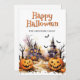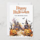 Happy Halloween card featuring watercolor illustrations of bats, jack o’lanterns and ghosts. Easily personalise this Halloween card with your family name and text.