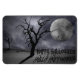 A scary Halloween illustration: Spooky landscape by night with the full moon, clouds and a dark tree silhouette with a hanging spider.
