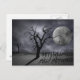 A scary Halloween illustration: Spooky landscape by night with the full moon, clouds and a dark tree silhouette with a hanging spider.