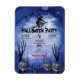 Spooky fun Halloween party invitation magnet with black and blue details of flying witch on her broomstick with her spooky pumpkin friends. Watercolor gloomy background. Easy to personalise creepy typography. Happy Halloween!