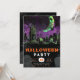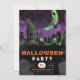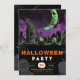 Get ready for a spooktacular event with this Halloween party invitation that perfectly captures the eerie excitement of the season. The top half of the invitation features a chilling cemetery scene bathed in the light of a large crescent moon. The sky is a haunting blend of black and purple, adorned with twinkling stars and fluttering bats that enhance the spooky atmosphere.
