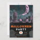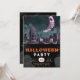 Prepare for a spine-tingling celebration with this Halloween party invitation! The top half of the design features a spooky cemetery, shrouded in the eerie glow of a large crescent moon. The grey sky above is punctuated with stars and drifting bats, creating a chilling and atmospheric scene that perfectly captures the essence of Halloween night.