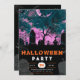 Prepare for a Halloween celebration like no other with this striking party invitation! The top half features a chilling cemetery scene set under a large crescent moon, with a grey sky adorned with twinkling stars and fluttering bats. The design bursts with vibrant neon pink and green hues, creating an otherworldly, eerie atmosphere that's perfect for setting the mood.