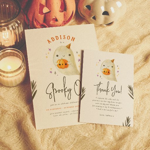 Invite family and friends for a spooktacular time with these cute Halloween birthday party invitations! This sweet design features a hand-painted illustration of a happy ghost with a purple bow carrying an orange pumpkin, surrounded by stars. The bottom of the invite is decorated with three autumn leaves. Above the ghost, in curved text, the birthday girl's name appears in rustic purple capitals. Below her name, "Spooky One!" is in modern hand lettering calligraphy - so the full phrase reads "GIRL is a Spooky One!" - perfect for a first birthday party! Underneath that, the event details are written out in 3 separate sections; the first, in italics, is an invitation to the guest to your little one's birthday; the next, in purple caps, is the date and time; and the last, in smaller capitals, is the venue and RSVP information. The color scheme for the text is a classic Halloween palette:
