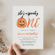 Cute, Halloween-themed birthday party invitations featuring the phrase "He/She's a Spooky One" in a handwritten script with a watercolor jack-o-lantern. Personalise the spooky 1st birthday party invitations with your party details below.