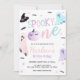 A not so spooky halloween party! Pastel pink, purple and orange Spooky One Ghost Halloween 1st Birthday invitation with black and white stripe background.