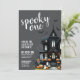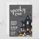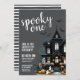 Welcome guests to a Halloween themed 1st birthday party with this fun and simple party invitation. Celebrate your one year old in spooktacular fashion! The design features a dark grey background with white fonts in a mix of simple and script typography. At the bottom is a black haunted house accented with orange pumpkins and jack-o’-lanterns. Cute little ghosts and bats round out this playful look. The back showcases a white and grey stripe pattern, which can be customised to suit your theme. Cute Spooky One First Halloween Haunted House Themed 1st Birthday Party Invitation.