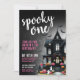 The back carries the same dark distressed background for a cohesive style. Available as a printed card or a downloadable digital card you can email or print locally. Cute Spooky One First Halloween Haunted House Themed 1st Birthday Party Invitation with Ghosts, Bats, and Distressed Style.