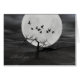 A flock of black ravens in silhouette fly over a spooky desolate landscape in front of a full moon.