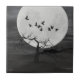 A flock of black ravens in silhouette fly over a spooky desolate landscape in front of a full moon.