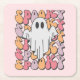 This fun and festive Halloween design features a classic ghost illustration front and centre, surrounded by the word "Spooky" repeated in a bold, bubbly font. The text is layered in vibrant, retro-inspired colours like soft pinks, purples, and oranges, creating a playful contrast against the ghost's simple white figure. The ghost's expressionless black eyes add a touch of eerie charm, while the wavy, stacked typography gives the design a groovy, nostalgic feel.