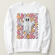 This fun and festive Halloween design features a classic ghost illustration front and centre, surrounded by the word "Spooky" repeated in a bold, bubbly font. The text is layered in vibrant, retro-inspired colours like soft pinks, purples, and oranges, creating a playful contrast against the ghost's simple white figure. The ghost's expressionless black eyes add a touch of eerie charm, while the wavy, stacked typography gives the design a groovy, nostalgic feel.