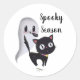 Spooky Season with a black cat and ghost classic round sticker for Halloween. Cute ghost and scared black cat bring to you the spooky season.