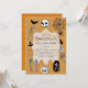Invite your guests to a ghoulishly good time with this spooktacular Halloween party invitation! The design showcases a playful arrangement of classic Halloween icons, including dancing skeletons, a mischievous black cat, a fluttering bat, and a creepy spider. The orange and grey striped background adds a fun and retro feel, making it perfect for any Halloween celebration. This invitation is ideal for announcing your haunted house party and ensuring all your fiendish friends can join the fun. Let the spooky festivities begin with this eye-catching invite!