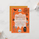 Invite your friends and family to a wickedly wonderful Halloween party with this adorable and spooky invitation! The cheerful orange and black striped background creates a festive atmosphere, while the charming illustrations of a black cat, a grinning jack-o'-lantern, a skeleton holding a drink, and a whimsical ghost add a touch of playful fright. The centerpiece text announces "Halloween Party" in a stylish font, leaving ample room for you to add all the essential party details. This design is perfect for announcing birthday parties, costume contests, or any gathering that calls for a touch of Halloween magic. Make your upcoming Halloween celebration an unforgettable event with these enchanting invitations that are sure to delight guests of all ages.