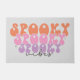 This design showcases the phrase "Spooky Spooky Spooky Vibes" arranged in a cascading, stacked format. The word "Spooky" is repeated three times, each in a different colour—starting with a vibrant orange, transitioning to a soft pink, and ending with a pastel purple. The letters are thick and rounded, giving a playful and bubbly appearance that contrasts with the spooky theme. The word "vibes" is written below in a delicate, black cursive font, adding a stylish touch to the overall design. Small star accents surround the text, enhancing the whimsical and festive mood. This design is perfect for a fun and light-hearted take on Halloween.