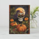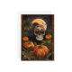 Haunting skull greeting card framed with tropical foliage and pumpkins - perfect to share greetings on Halloween or Day of the Dead.
