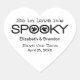 Fun and quirky Spooky Typography Halloween Save the Date Stickers in white and black featuring a fun text design of the word "spooky" with a pair of charming ghosts haunting the two "O" letters. This chic design is perfect for announcing your wedding date around or on Halloween. Easy to customise, simply add the details of you wedding in the text fields provided. For more customisation options, click on the "Customise It" button to change fonts, text colours or move the design element.