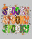 A colourful and playful Halloween-themed design featuring the word “Spooky” repeated three times in bold, vibrant letters. Each letter is uniquely decorated with Halloween icons like witches’ hats, ghosts, spider webs, pumpkins, and animal prints, all in a patchwork of festive fall colours—perfect for Halloween apparel and party designs!