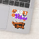 This delightful Halloween sticker sheet features two separate designs, each with its own unique charm. The first sticker showcases the phrase “Spooky Vibes” in vibrant orange, white, purple, and black colours. With a delightful retro feel, two white ghosts cleverly replace the “o” letters in the word “spooky.” Surrounding the text are playful black bats, a heart, and retro-inspired flowers, adding to the festive and nostalgic vibe. The second sticker, in a bold orange and black colour scheme, features a thick black border that follows the contour of the design elements. This sticker highlights black bats and stars, creating a striking and festive look with a retro vibe. Ideal for Halloween enthusiasts, these stickers are perfect for personalising items like laptops, notebooks, or phone cases. Their cut-to-shape design allows for versatile application on various surfaces, making them a fun and creative way to celebrate the season.
