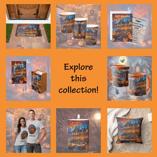 This aper cups features a spooky mansion in the forest with illuminated windows surrounded by lots of pumpkins. Perfect for your Halloween party! Custom text.