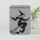 This customisable halloween invitation has a halloween image of a funny black witch flying through the sky on her magic broomstick, with her pointy witches hat on her head and her long black witches dress flowing behind her, she looks great on this quality Halloween party invite, I’m sure everynyone will be glad to recieve this spooky flying witch invitiaion. This original invitation can be personalised with your own text.