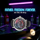 This vibrant watch face features a red and black sport motorcycle driving on a road. In the background, a large American flag is dramatically set against a sunset sky with a prominent full moon. The colourful scene includes reflections on the wet road and subtle foreground foliage, creating a bold and patriotic design for motorcycle enthusiasts.