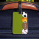 Luggage tag with baseball, football, soccer ball and basketball on green background.