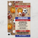 Enjoy this sports all-star birthday invitation, SCORE! It's the perfect way to invite guests to your child's sports themed birthday party. This is a sporty styled sports invitation with a wood background!