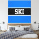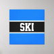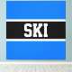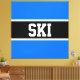 This sporty design features athletic SKI text inside a wide horizontal black middle stripe highlighted in white against bright alpine blue outer stripes. The text is optional and can be personalised.