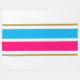 This chic, sporty design features a white background with wide bright sky blue and bold pink centre horizontal stripes adjoined with warm brown pinstripes.