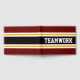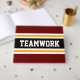 This colourful, sporty design features athletic TEAMWORK text inside a wide black horizontal centre racing stripe with adjoining bright golden yellow and white stripes against deep red outer edge stripes. The colours and text in this design can be personalised.