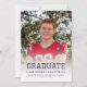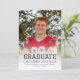Graduation announcement featuring a custom photos on the front and back. The word "Graduate" appears in bold navy blue typography with a sporty look ideal for the student athlete, with the graduate's name, school, and year of graduation below in sans serif font. The back features a horizontal photo, with space for details about your graduate's achievement and future plans in gold text on a navy blue background. A good choice for high school or college graduation.