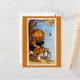 Vintage Halloween greeting card illustration of a Pumpkin Girl frightened by ghosts and a spider.