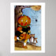 Vintage Halloween greeting card illustration of a Pumpkin Girl frightened by ghosts and a spider.