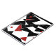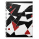 Various white and red geometric shapes are scattered across a black background, creating a stark contrast. Some shapes are interconnected with thin white lines, and red dots add a pop of color to the composition.