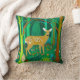 Pillow in a stylised illustration of a cute, spotted fawn in a fairytale forest setting, surrounded by trees and plants, in shades of brown and green