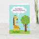 This design shows a tall, long‑necked animal with a bright yellow coat and warm brown spots, standing on fresh green ground under a pale blue sky. Its rounded eyes and soft pink cheeks give it a tender, friendly look, as if it’s sharing a quiet moment with someone just off to the side 🐰. The animal holds a small patterned basket in its mouth, and inside sit two decorated eggs—one pink and one green—nestled close together like a little shared treasure. To the right, a stylized tree with an emerald‑green canopy spreads wide, and its branches feel welcoming, like they’re inviting you to join the search 🌷. Dozens of pastel eggs hang among the leaves with stripes and dots in lavender, coral, and light blue, and a few small open baskets dangle from sturdy limbs, each filled with more eggs. Near the top, a cloud‑shaped thought bubble contains the message “Great Nephew Happy Easter Egg Hunting” in dark lettering, placed above the animal’s head for easy reading. The tree’s rounded canopy is dotted with eggs in mixed patterns, and several tiny baskets hang at different heights from the branches.