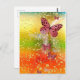 This beautiful spotted mauve or pink butterflies are set on an orange, green, yellow and blue background. They appear to be resting on tiny bubbles. There is a less apparent gold and white butterfly.