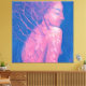 Canvas print, featuring colourful surreal artwork, youthful dryad girl with dreamy smile, forest trees and flowers growing from her back. She is an embodiment of awakening nature and coming spring. Surreal / fantasy art, pagan & wicca theme, pastel painting in pink and ultramarine blue.