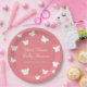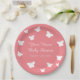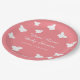 Spring baby shower party coral pink butterfly Paper Plates. Custom design with white butterfly silhouettes. Add as many butterflies as you want. Elegant script typography template. Part of matching collection suite. Colour palette can easily be changed.